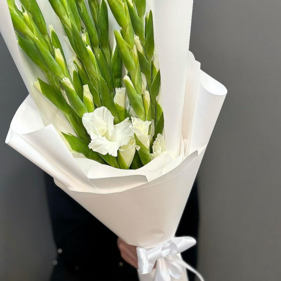 На фото букет из 11 белых гладиолусов. В составе: гладиолус 11 шт, дизайнерская упаковка 1 шт, . Все цветы свежие и ароматные, букет красиво оформлен и отлично подходит для подарка. Доступна доставка цветов или самовывоз.