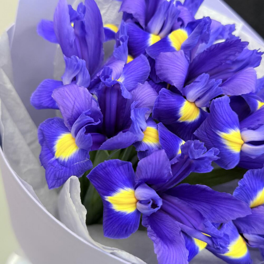На фото букет из 11 фиолетовых ирисов. В составе: ирис 11 шт, фоамиран 2 шт, атласная лента 1 шт, . Все цветы свежие и ароматные, букет красиво оформлен и отлично подходит для подарка. Доступна доставка цветов или самовывоз.