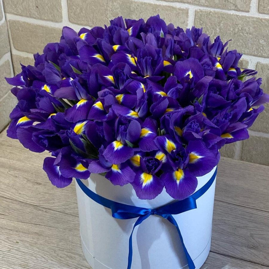 На фото 45 фиолетовых ирисов в шляпной коробке. В составе: ирис 45 шт, оазис флористический 1 шт, шляпная коробка (m) 1 шт, атласная лента 1 шт, . Все цветы свежие и ароматные, букет красиво оформлен и отлично подходит для подарка. Доступна доставка цветов или самовывоз.