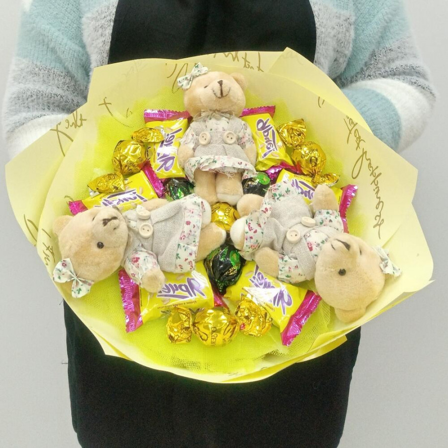 Лента атласная - 1 шт. Упаковка дизайнерская - 2 шт. Медведь плюшевый - 3 шт. Конфеты марсианка - 3 шт. конфеты озера - 4 шт. конфеты ярче - 6 шт.