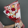 Роза одноголовая - 7 шт. Лента атласная - 1 шт. бумага дизайнерская - 6 шт. конфеты киндер палочка - 5 шт. конфета киндер сюрприз - 3 шт. конфета киндер буэно - 2 шт. конфета киндер кантри - 2 шт. конфета батончик нутелла - 1 шт.