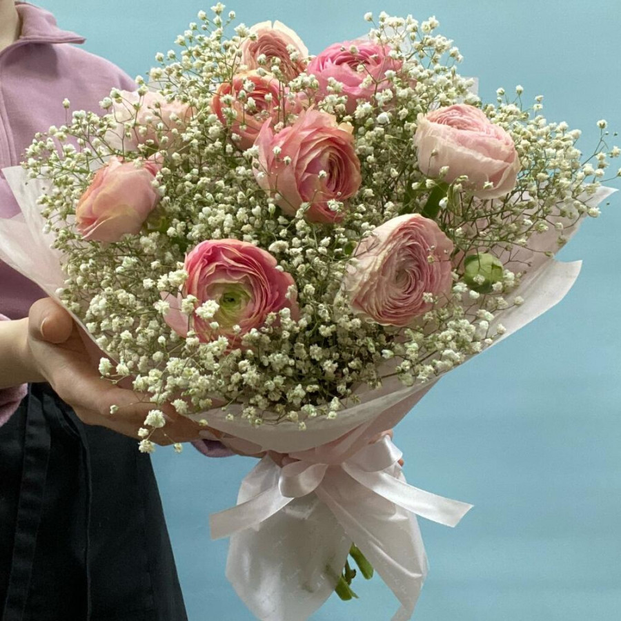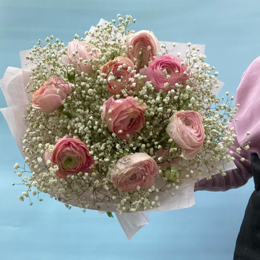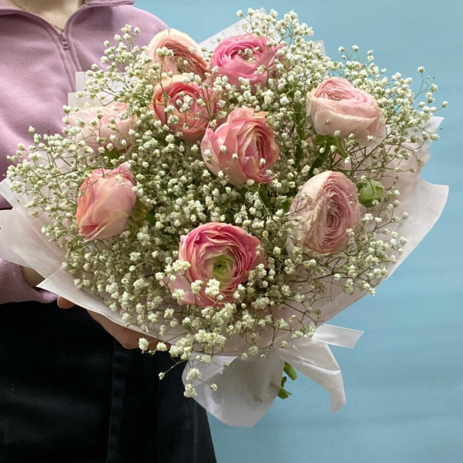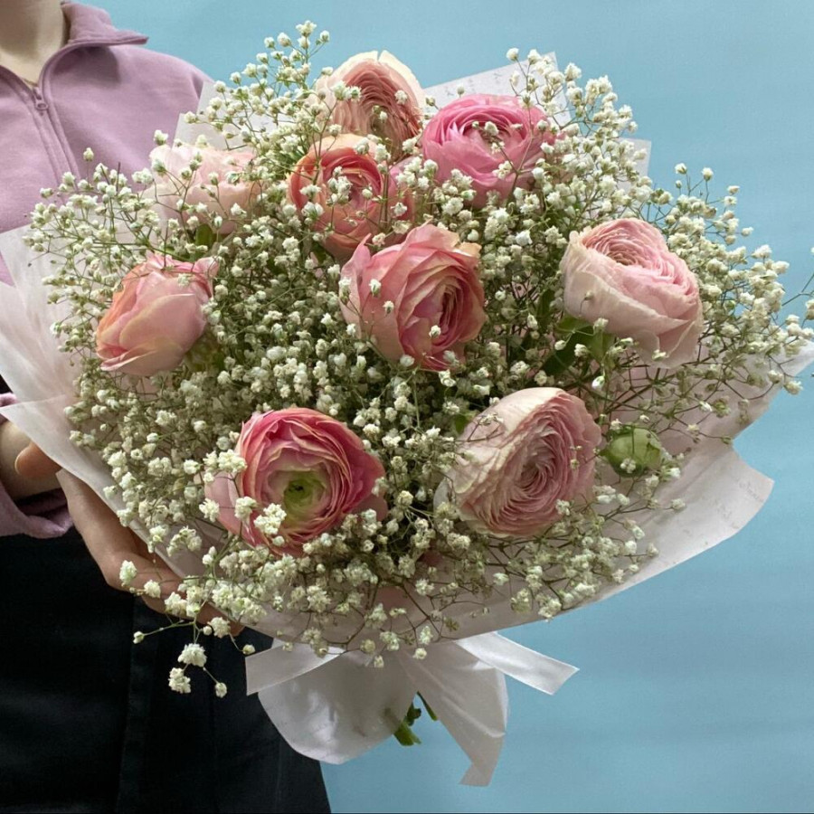 Букет из розовых ранункулюсов с белой гипсофилой в Сибае