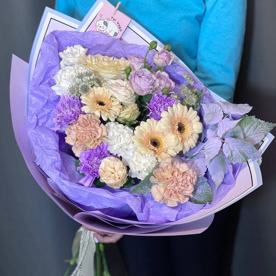 На фото сборный букет с герберами. В составе: гербера 3 шт, кустовая пионовидная роза 2 шт, гвоздика 7 шт, леувенбек 1 шт, эвкалипт 1 шт, крафт-бумага 1 шт, . Все цветы свежие и ароматные, букет красиво оформлен и отлично подходит для подарка. Доступна доставка цветов или самовывоз.